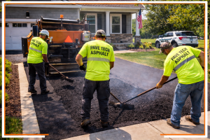 Asphalt paving crew installing driveway for first responder family in Illinois